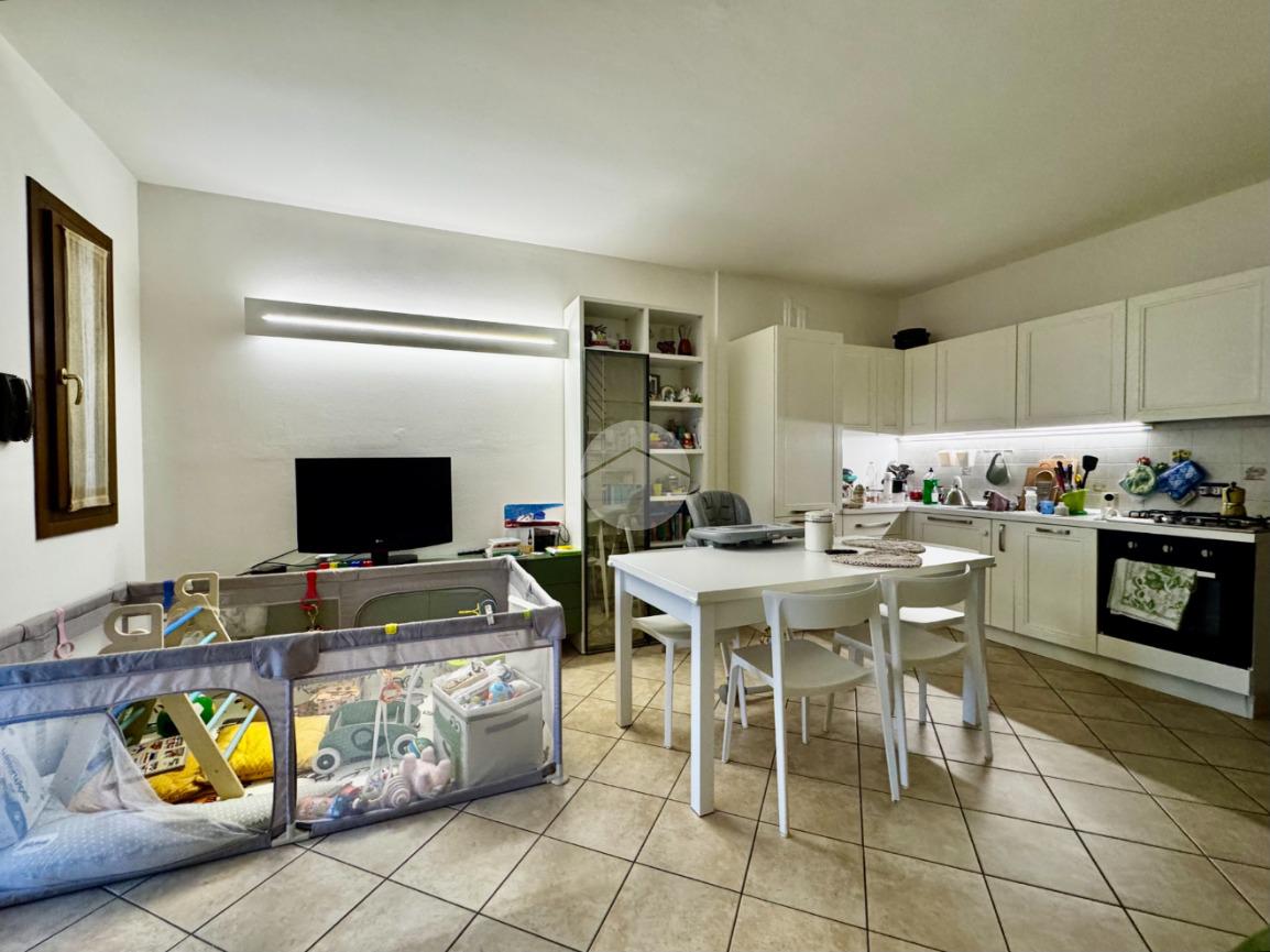 L'immobile si trova al primo piano ed è così composto: terrazzo coperto dal quale si accede al luminoso soggiorno con cucina a vista, camera matrimoniale e bagno finestrato.